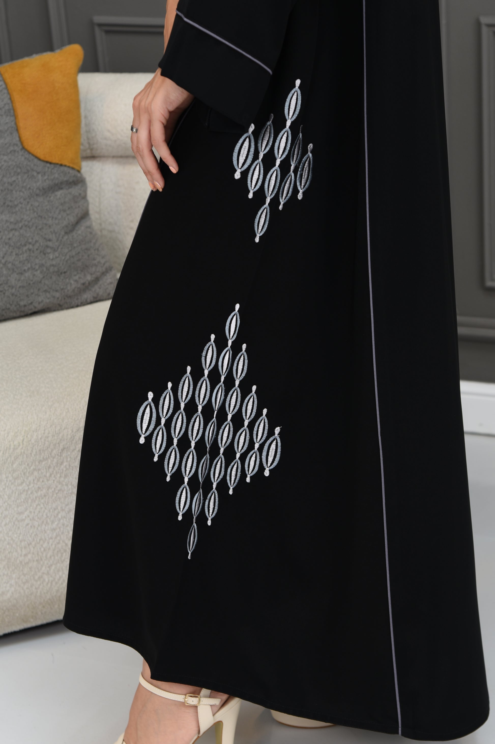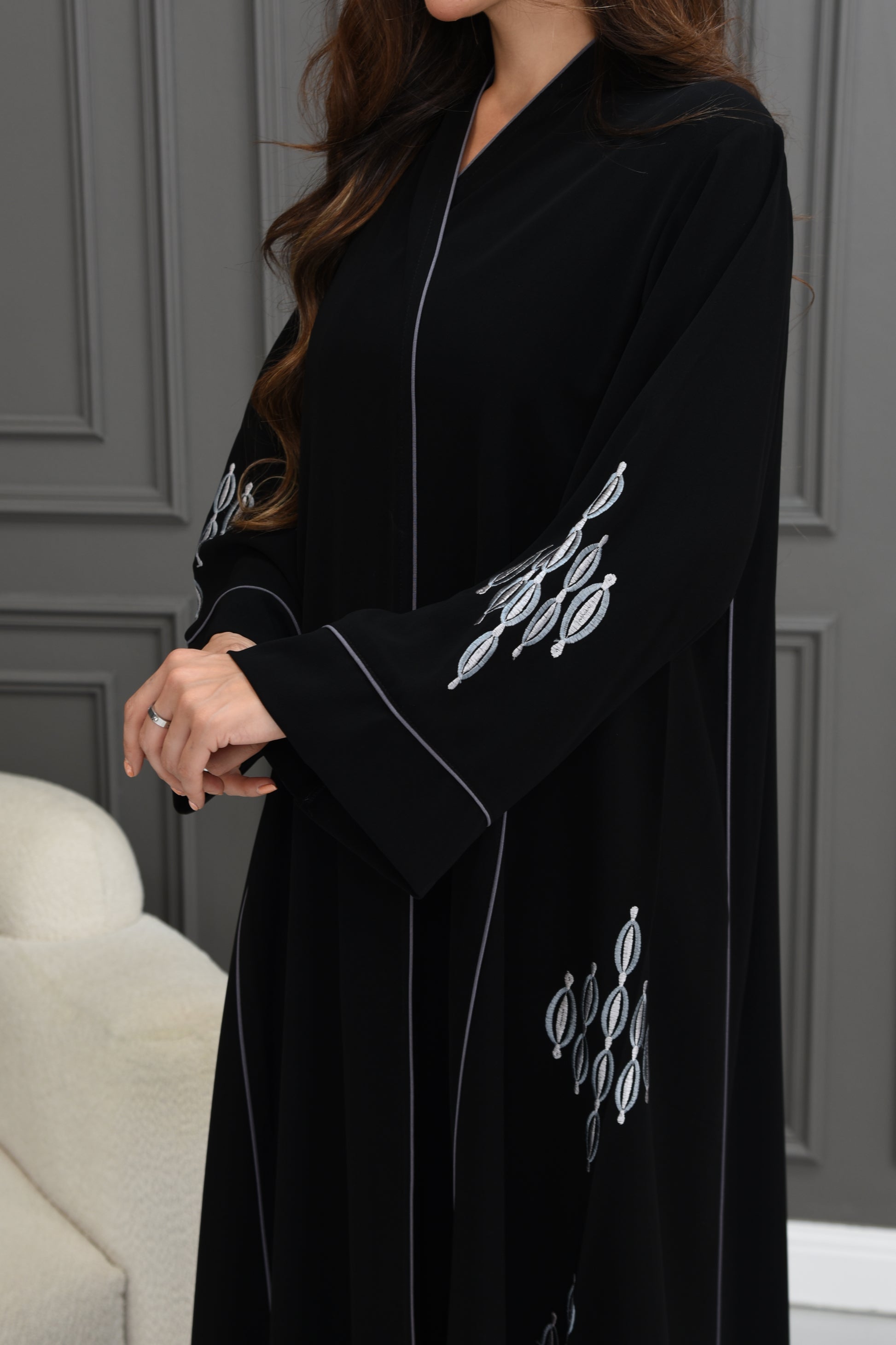 An elegant black besht, crafted from luxurious crepe fabric, featuring square sleeves with distinctive white and sky-blue embroidery on the sleeves and hem. It is adorned with stylish gray cords, adding a refined touch of elegance and sophistication.