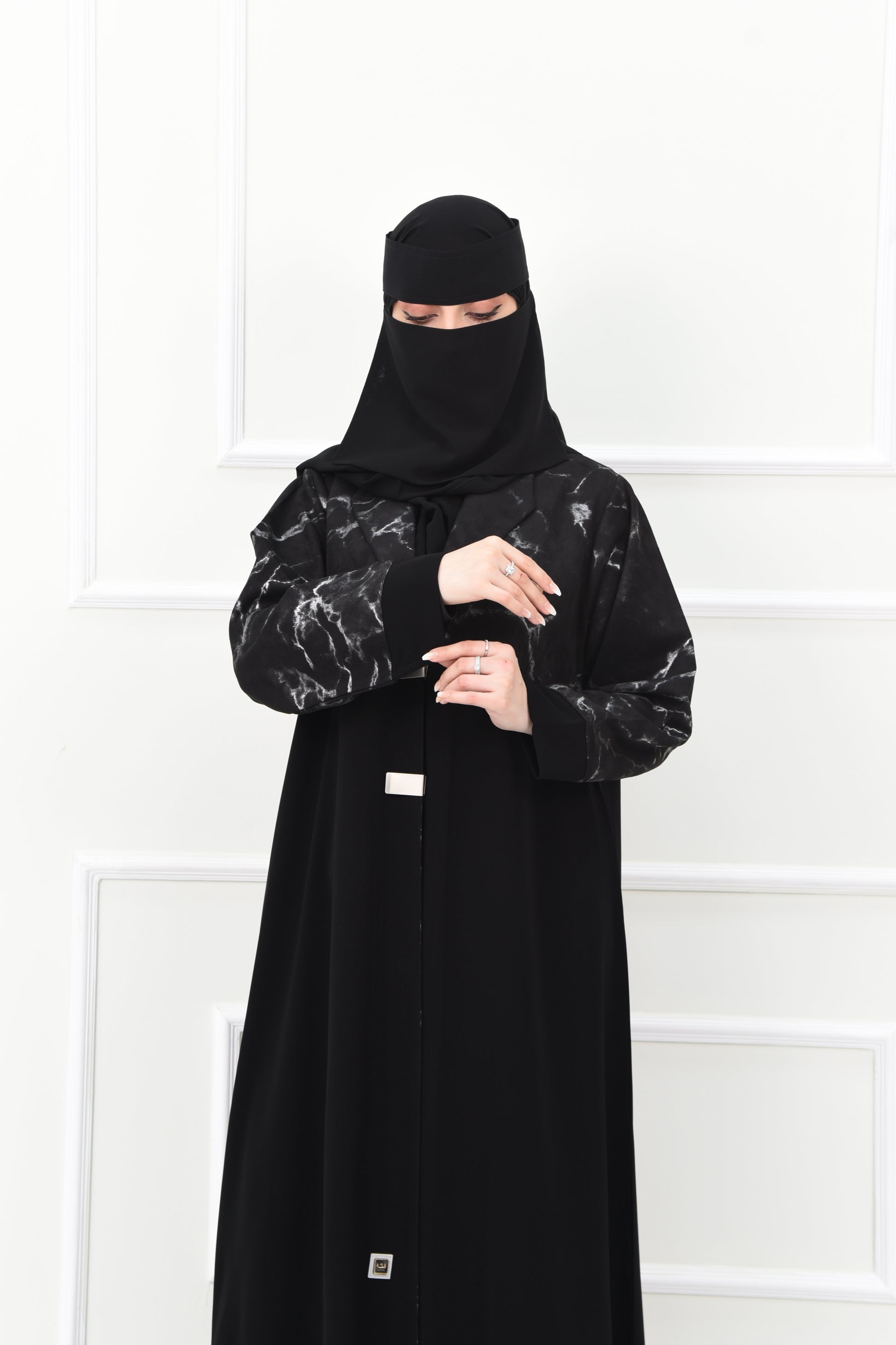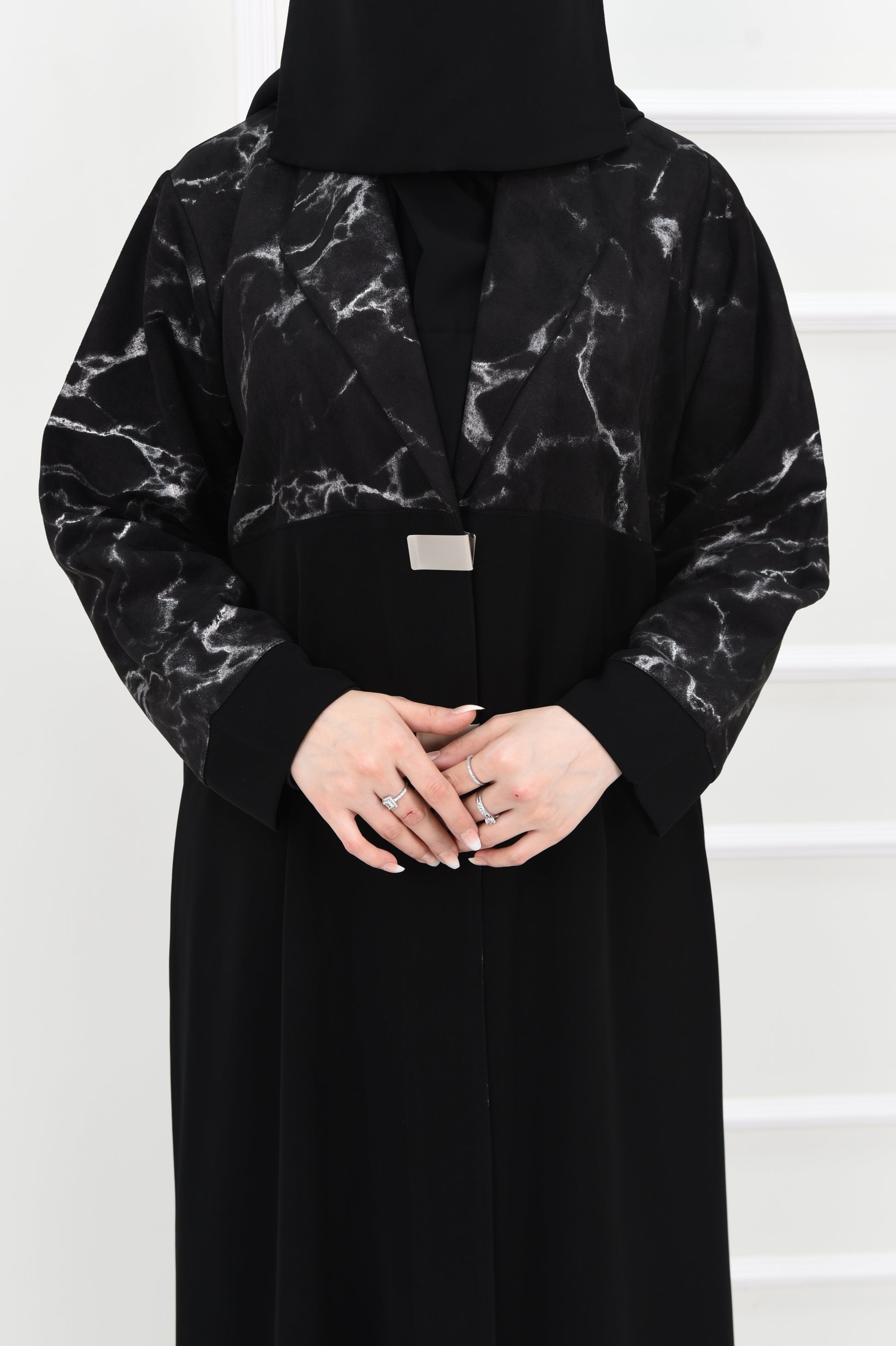 Elevate your wardrobe with this elegant black abaya featuring a striking marble-effect pattern across the upper bodice and sleeves. Designed for the modern woman, the abaya showcases a clean silhouette complemented by a sleek metallic clasp at the front for a touch of contemporary flair. Crafted from premium fabric, it offers both comfort and sophistication—perfect for formal occasions or upscale everyday wear. Style it effortlessly with heels or flats for a timeless look.