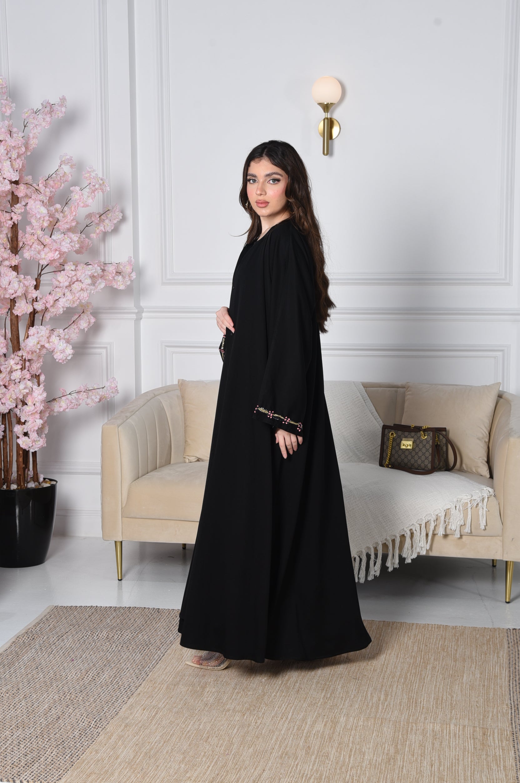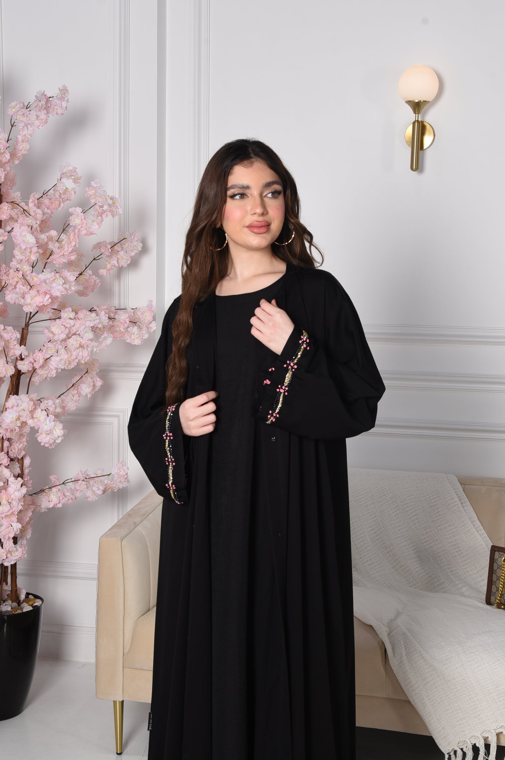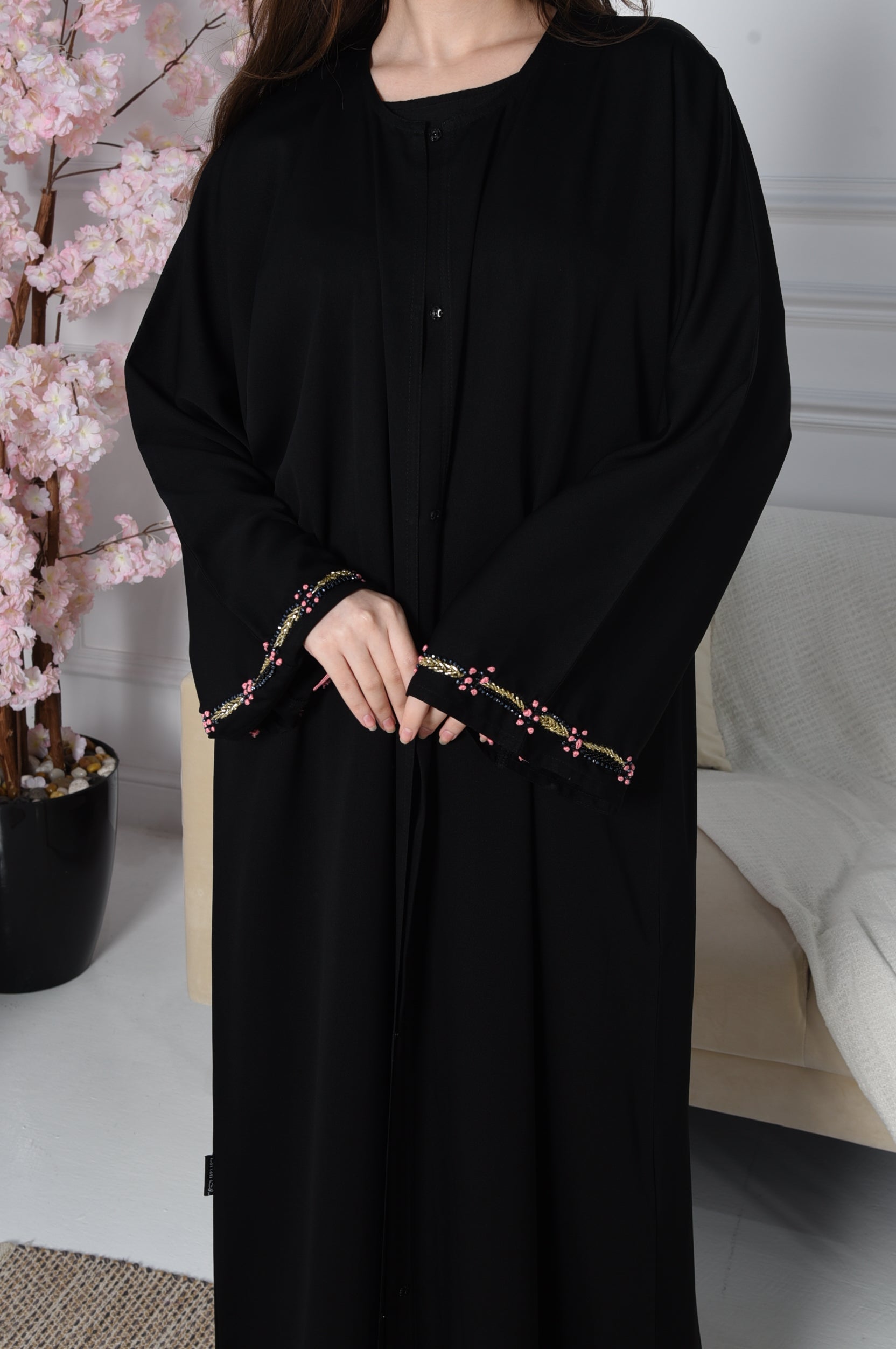 Crafted from soft black crepe, this elegant abaya embodies refined simplicity and timeless style. The standout feature lies in the intricate embroidery on the sleeves, where soft pink and shimmering gold threads come together in perfect harmony—offering a graceful blend of beauty and luxury.