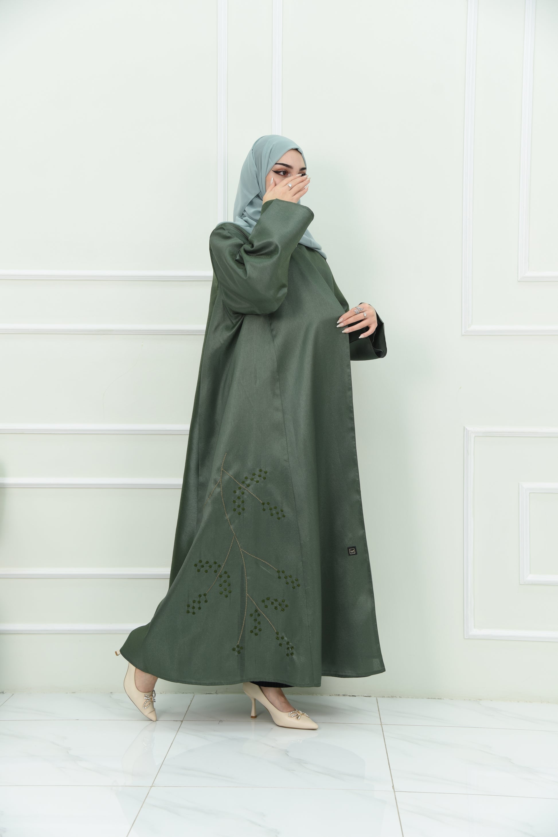 An elegant olive green abaya designed with an exquisite embroidery along the lower hem