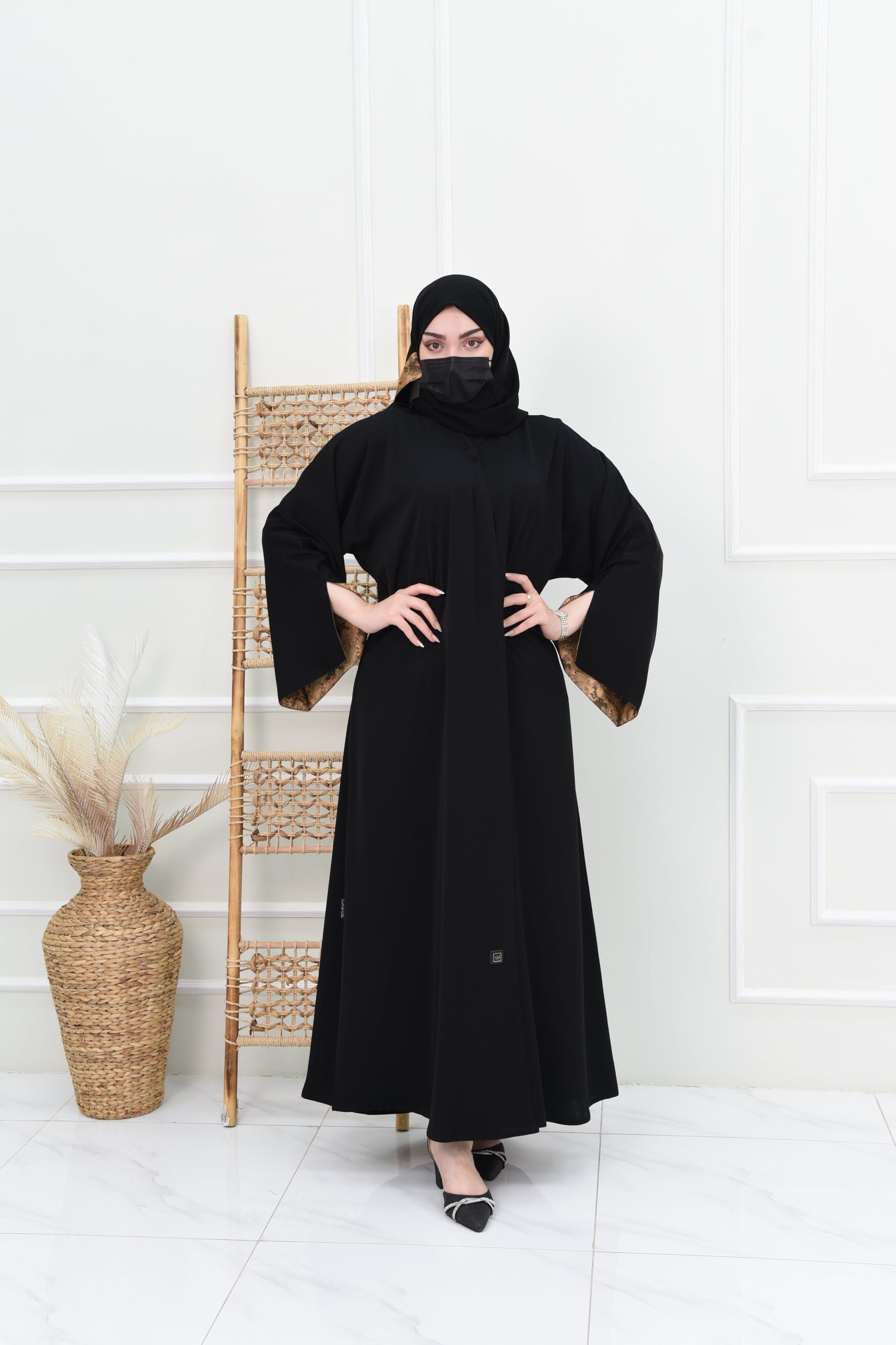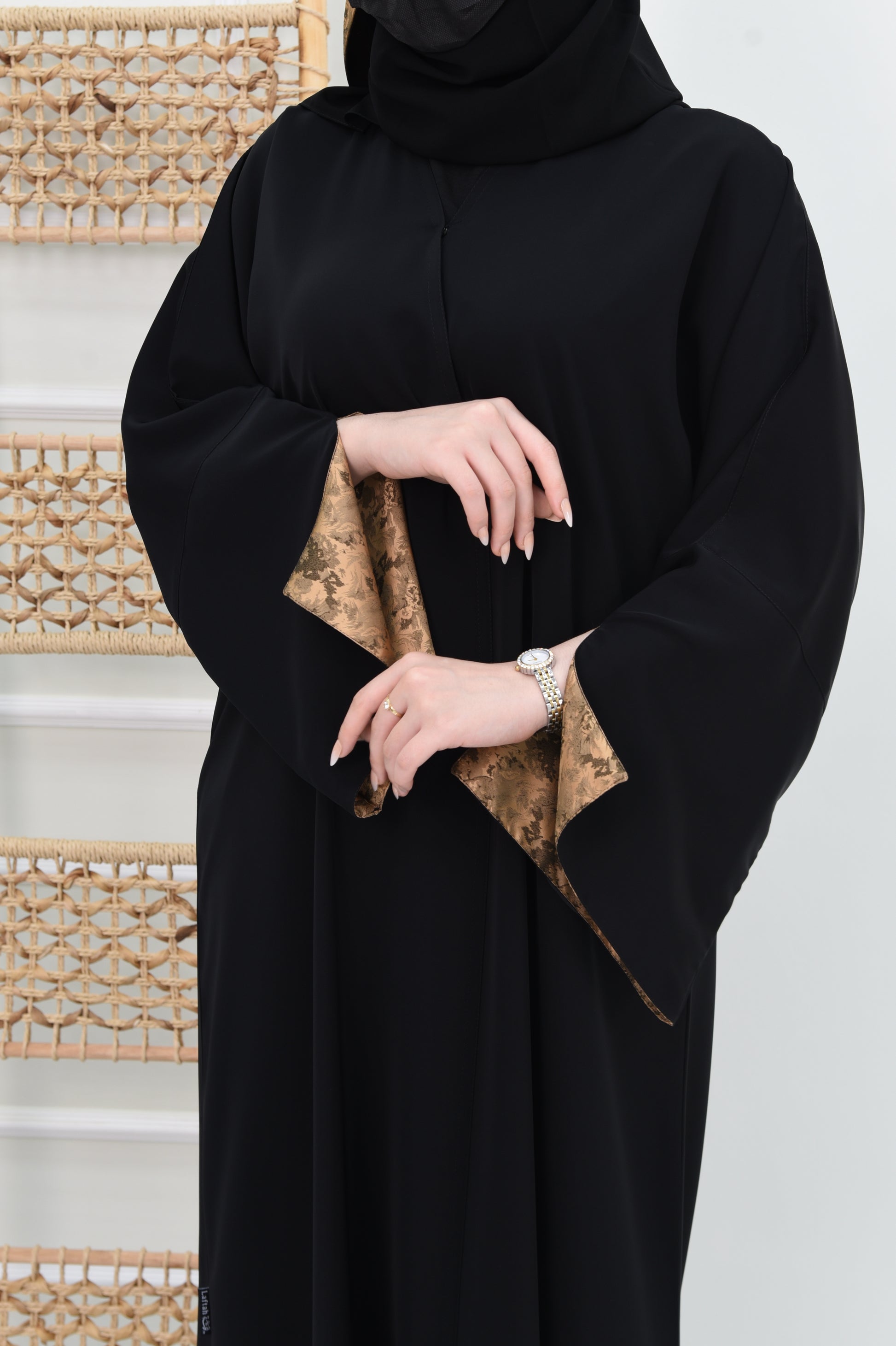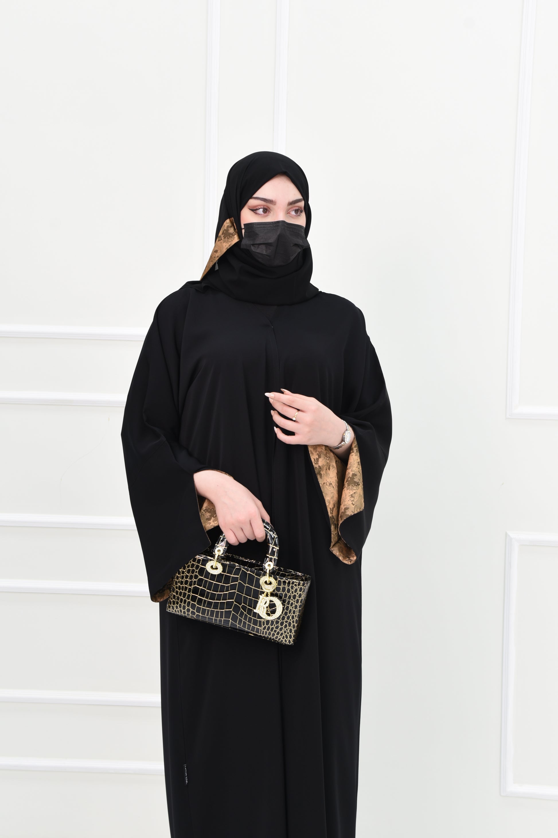 Elevate your style with this elegant black abaya crafted from “The Sweetest Gesture” fabric—renowned for its soft, silky texture and graceful drape. This sophisticated design features open sleeves lined with rich brown jacquard fabric, offering a modern and refined contrast that enhances the overall silhouette.