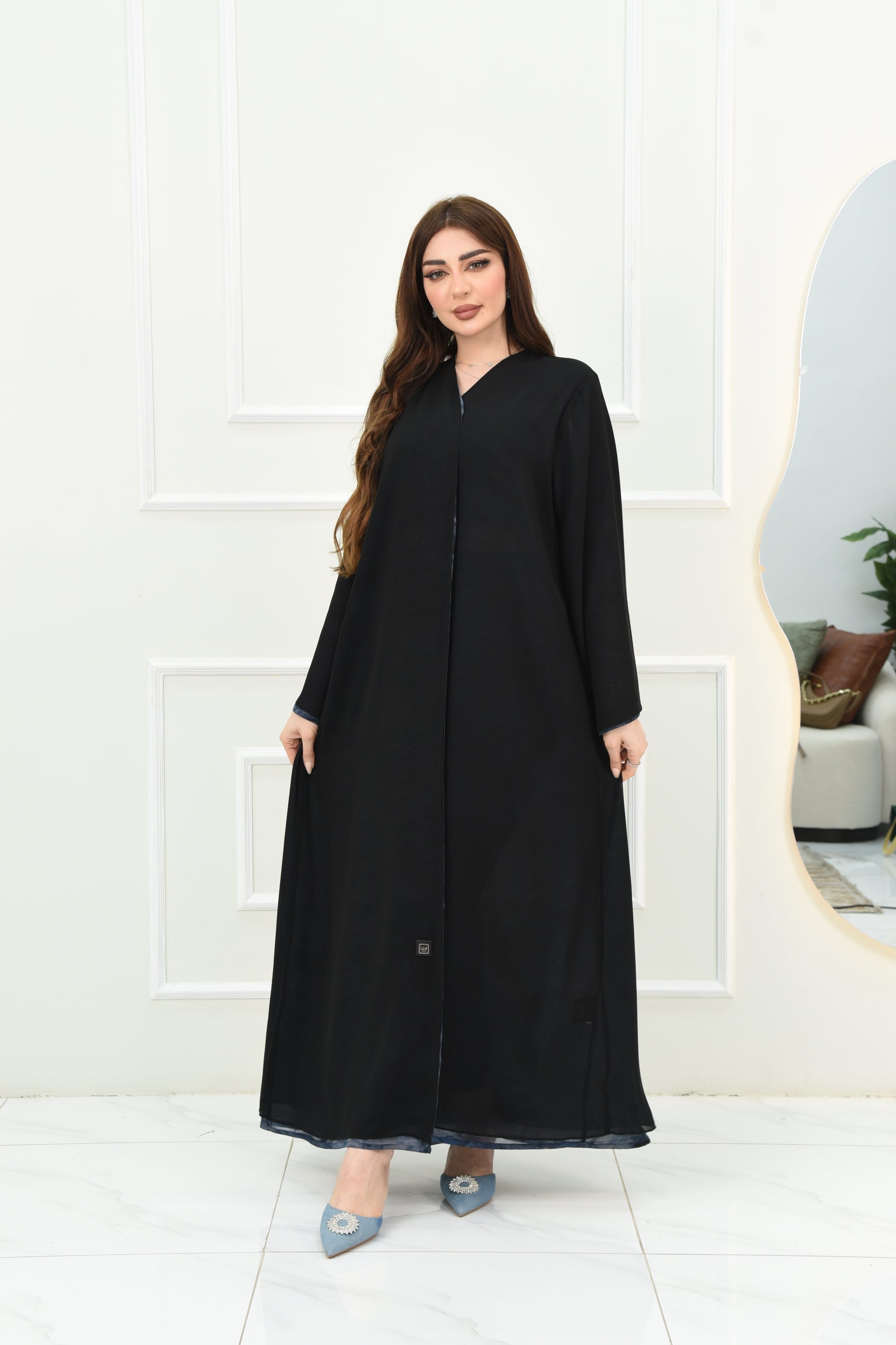 An elegant double-face abaya crafted from luxurious chiffon fabric, designed to offer two refined looks in one. One side features a timeless classic black, while the reverse showcases warm shades of navy blue. This modern and versatile design allows you to switch styles with ease, adding a fresh touch of elegance for every occasion.