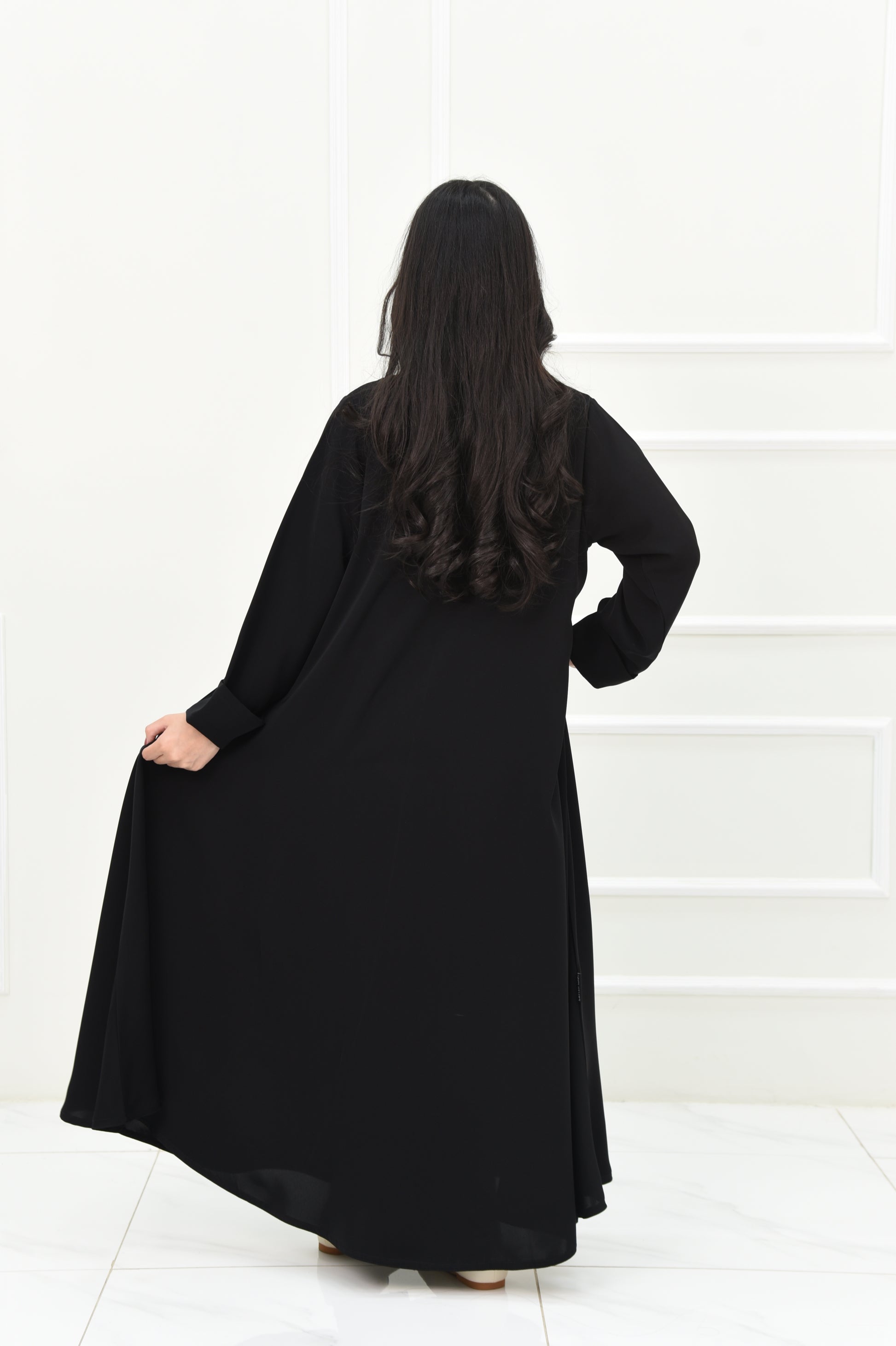 A stylish and modest abaya designed for young girls, combining comfort with classic elegance. This abaya features a flared (A-line) cut that allows for easy movement, and a front zipper closure for added convenience and practicality